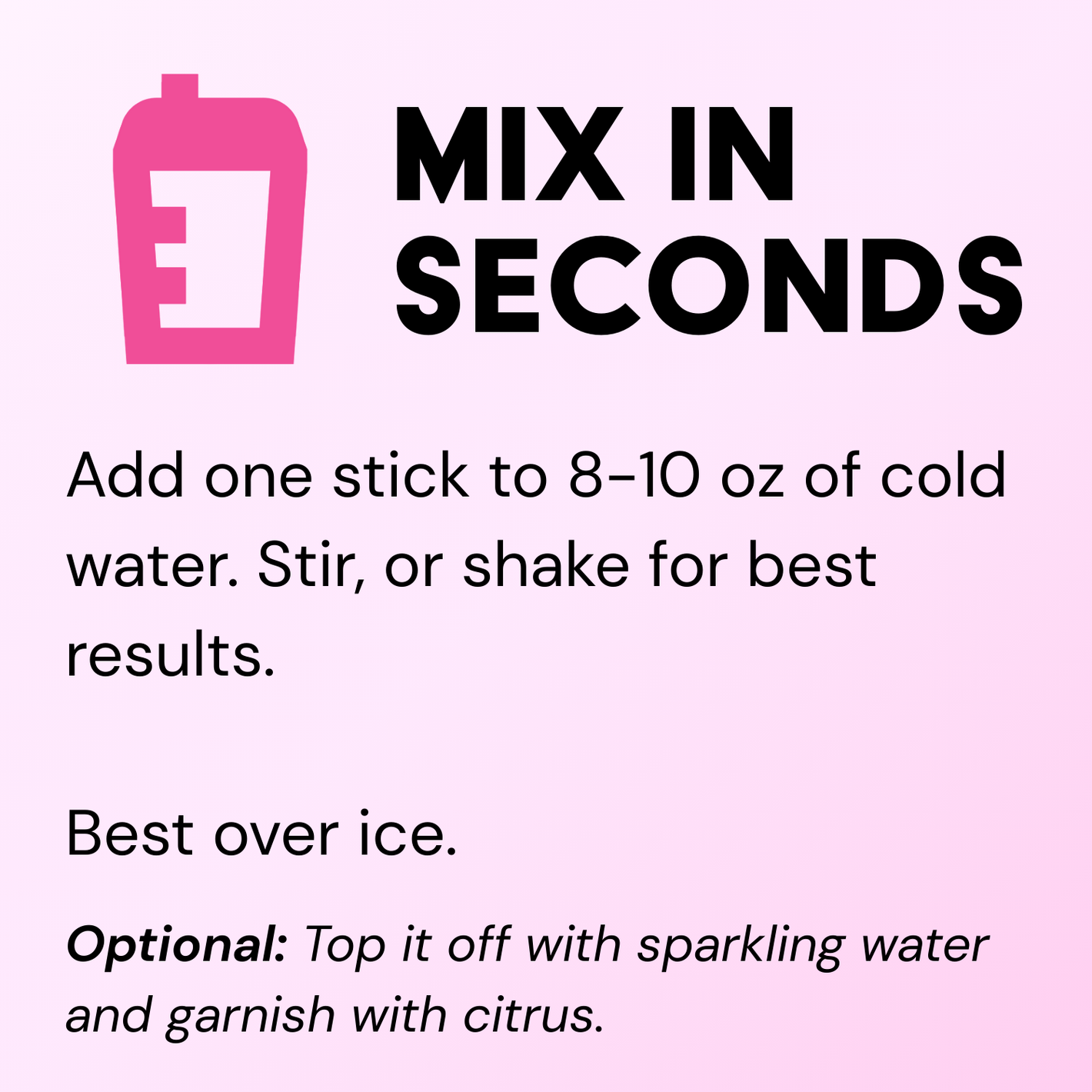 For the best experience, we recommend stirring or shaking one stick pack of HappySoul with 8 oz of cold water in a shaker with ice. For a refreshing twist, top it off with your favorite sparkling water or a splash of juice, and enjoy the good vibes!